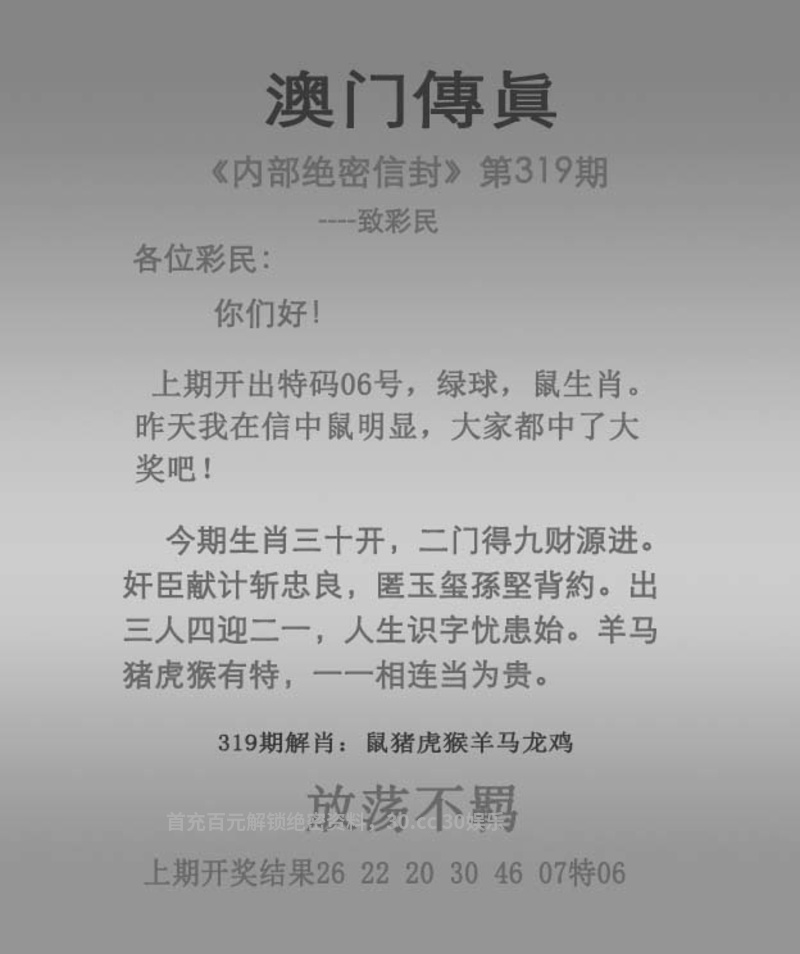 | 319期 今期生肖三十开,二门得九财源进 奸臣献计斩忠良,匿玉玺孫堅背約 出三人四迎二一,人生识字忧患始 羊马猪虎猴有特,一一相连当为贵 |